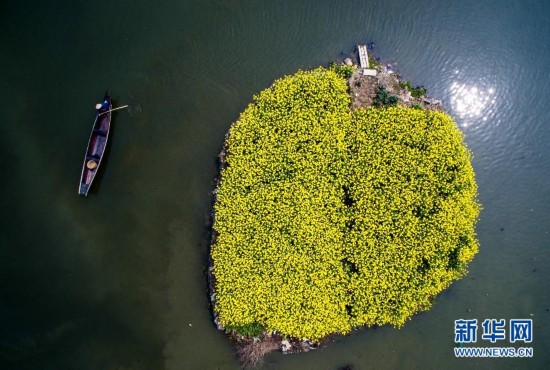 2015年3月29日,一艘小船从浙江省杭州市余杭区塘栖镇丁山河村一个种满油菜花的小岛边经过。这个小岛原本是丁山河村村民养猪的地方,为了美化村落,减少污染,猪圈被改成了油菜地。中国农村环境正拉响警报。一方面,工业和城市污染正向农业农村转移排放;另一方面,来自农业本身的污染也相当惊人:化肥、农药等农业投入品过量使用,畜禽粪便、农作物秸秆和农田残膜等农业废弃物不合理处置,曾经的“田园净土”正经历各类污染的侵害。新华社记者徐昱 摄