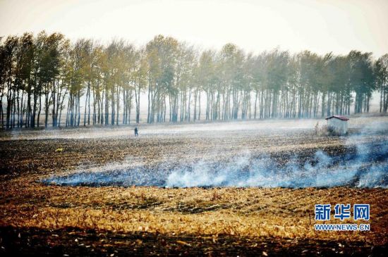 2014年10月11日,在哈(尔滨)同(江)公路沿线的农田中,焚烧的秸秆冒出浓烟。中国农村环境正拉响警报。一方面,工业和城市污染正向农业农村转移排放;另一方面,来自农业本身的污染也相当惊人:化肥、农药等农业投入品过量使用,畜禽粪便、农作物秸秆和农田残膜等农业废弃物不合理处置,曾经的“田园净土”正经历各类污染的侵害。新华社记者王建威 摄