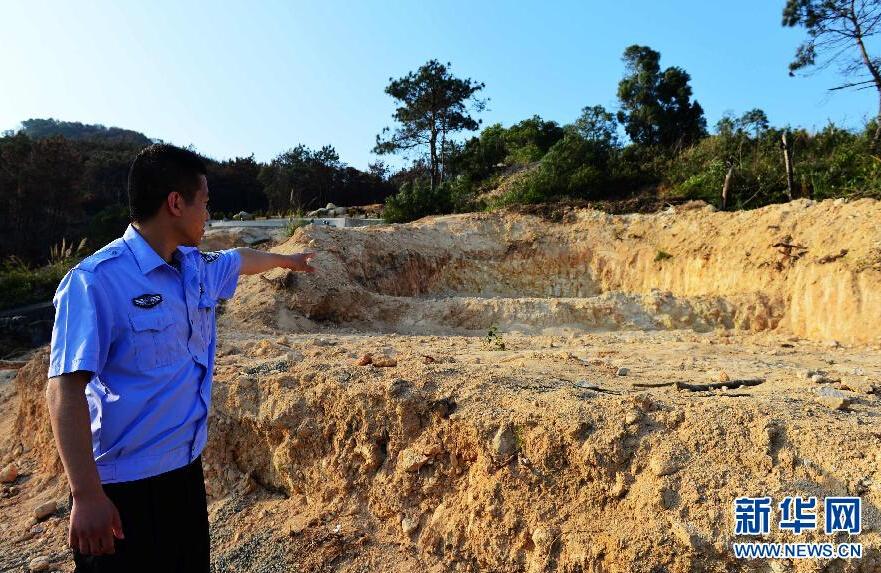 4月16日,在福清市海口镇洋坂村的一座山头上,福清森林公安民警在调查一座占地800多平方的墓穴。 新华社记者 魏培全 摄图片来源:新华网
