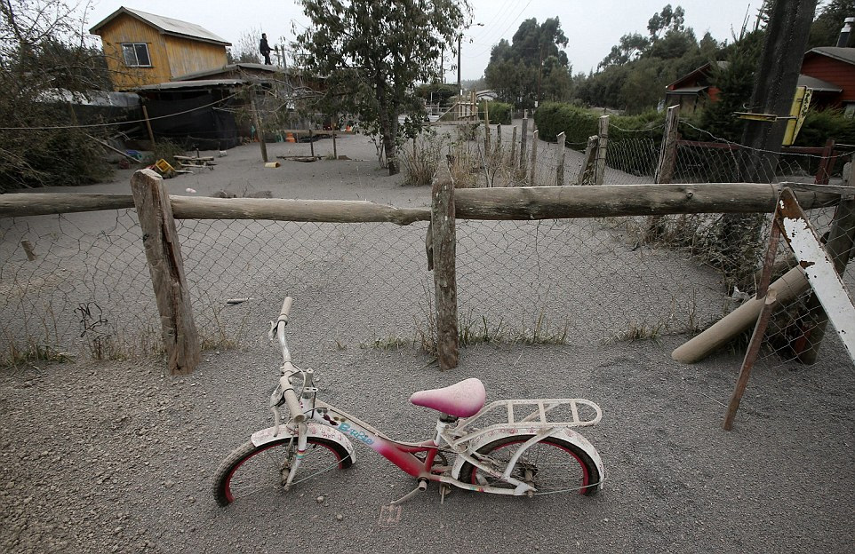 当地时间2015年4月23日,智利ENSENADA,22日,Calbuco火山在40年后爆发,附近的城市地面、屋顶上留下了厚厚的一层灰,整座城市变成了灰色。目前已有4000多人撤离。