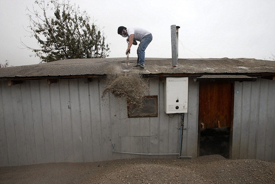 附近的城市地面、屋顶上留下了厚厚的一层灰,整座城市变成了灰色。附近居民清除自己屋顶的火山灰。