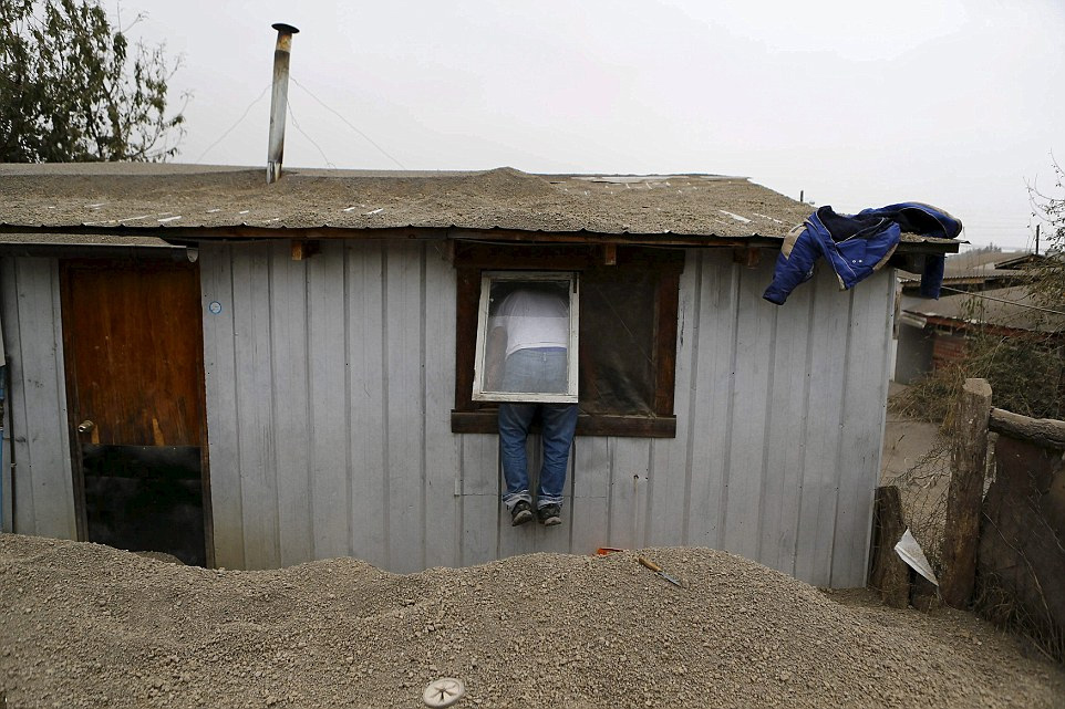 附近的城市地面、屋顶上留下了厚厚的一层灰,整座城市变成了灰色。附近居民清除自己屋顶的火山灰。