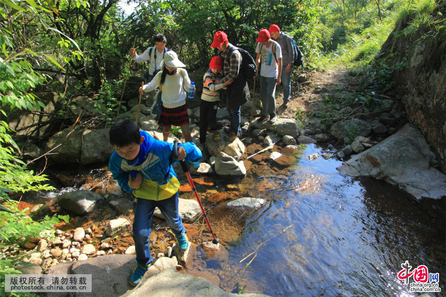 2015年4月25、26日,来自上海、南京、无锡、徐州、淮安等地的1000多名游客,带着家人不约而同来到安徽省宁国市万家乡境内吴越古道,徒步穿越体验吴越古道的艰险。吴越古道全长约35公里,为五代十国时期吴越(浙江)与南唐(安徽)的主要通道。中国网图片库 作者:杨彬