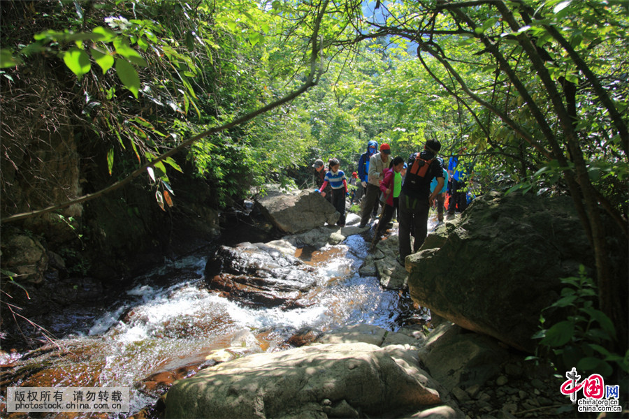 2015年4月25、26日,来自上海、南京、无锡、徐州、淮安等地的1000多名游客,带着家人不约而同来到安徽省宁国市万家乡境内吴越古道,徒步穿越体验吴越古道的艰险。吴越古道全长约35公里,为五代十国时期吴越(浙江)与南唐(安徽)的主要通道。中国网图片库 作者:杨彬