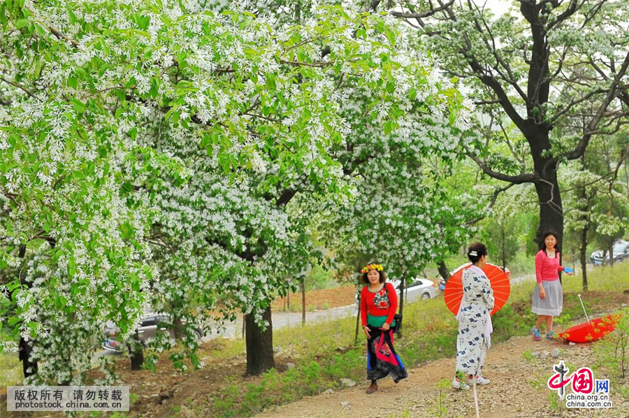 2015年4月29日,游客在山东省青州市邵庄镇雀山风景区欣赏流苏花。中国网图片库 王继林/摄