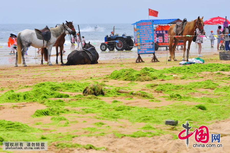 中国网7月6日讯(记者 舒珺刘明照)2015年7月5日,游客在山东省日照市山海天旅游度假区太公风景区的布满浒苔的沙滩上骑马游玩。抬眼望去,游客骑马似驰骋在辽阔的草原。连日来,小面积的浒苔持续侵袭日照海滩,并没有大面积的暴发,前来游玩的游客并未受到影响。