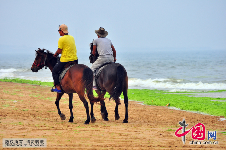 山东日照浒苔侵袭海滩 沙滩骑马似驰骋草原