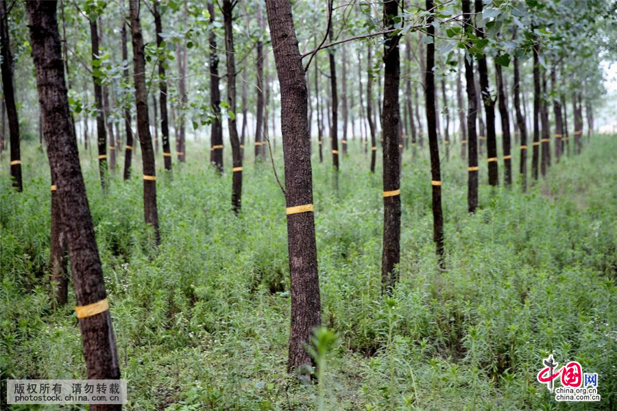 在安徽省六安市苏家埠滩上,数千棵白杨树都被裹上胶纸。中国网图片库 雨盛/摄