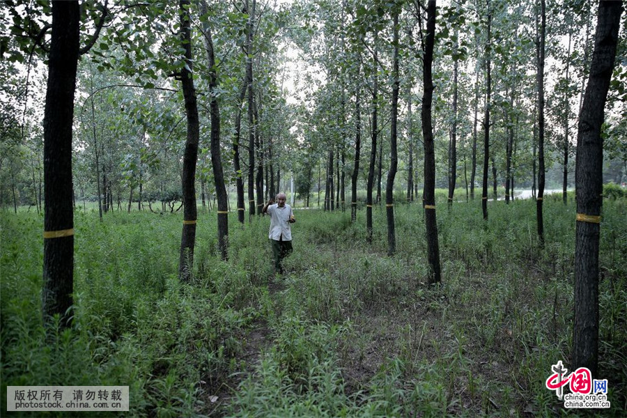 在安徽省六安市苏家埠滩上,数千棵白杨树都被裹上胶纸。中国网图片库 雨盛/摄