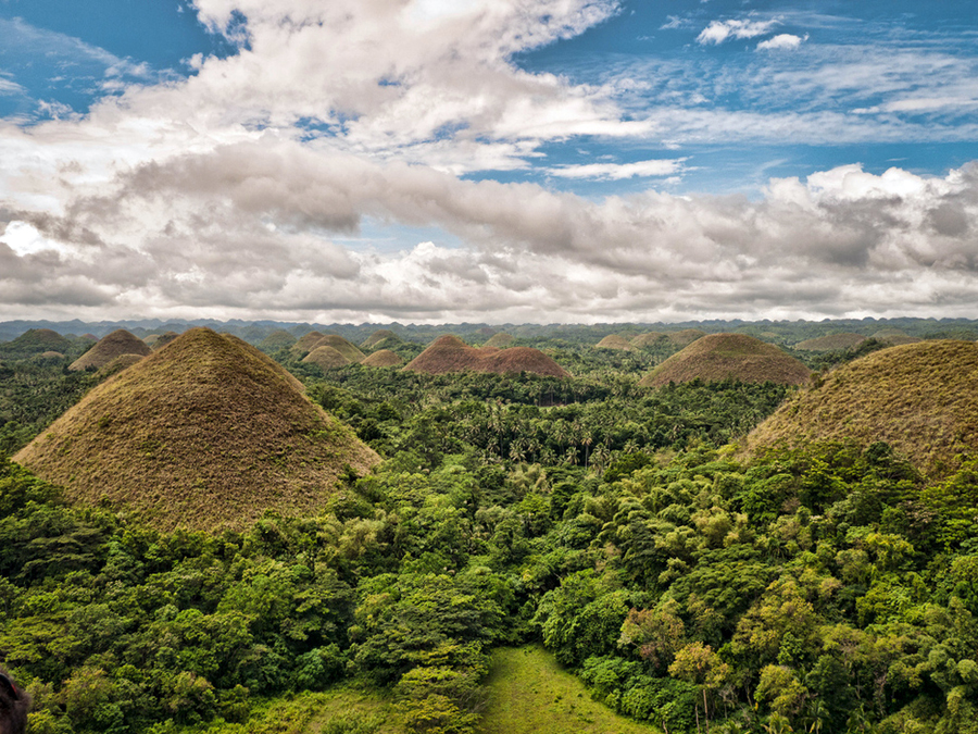 巧克力山是菲律宾保和岛中部,卡门附近一处自然奇景。由1268个圆锥形小山丘组成的巧克力山,高度介于 40到120公尺之间。每到夏季,“干草堆”都会干枯,转为褐色,犹如一排排的巧克力排放在大地上,巧克力山这个名字由此而来。巧克力山都由石灰岩组成,可没有一般石灰岩地区所常见的溶洞系统或地下通道。这些山丘像田野上的干草堆一般紧挨在一起。有些有圆顶,其他的呈锥形。它们上面覆盖着乱草,在雨季时色彩呈彩绿。在2—5月份的旱季里,炎热的太阳将这些草晒干,变成巧克力般的褐色。山丘的名字便是这样得来的。巧克力山的植被也具有奇异之处。山上都要长树长草。处在亚热带,热带临海地区的山,雨量充沛,山上的植物都疯着长。巧克力山周围其他形态的山无不如此,独独这种特大号的超级馒头,却是基本上只长草不长树,更称不上有林。