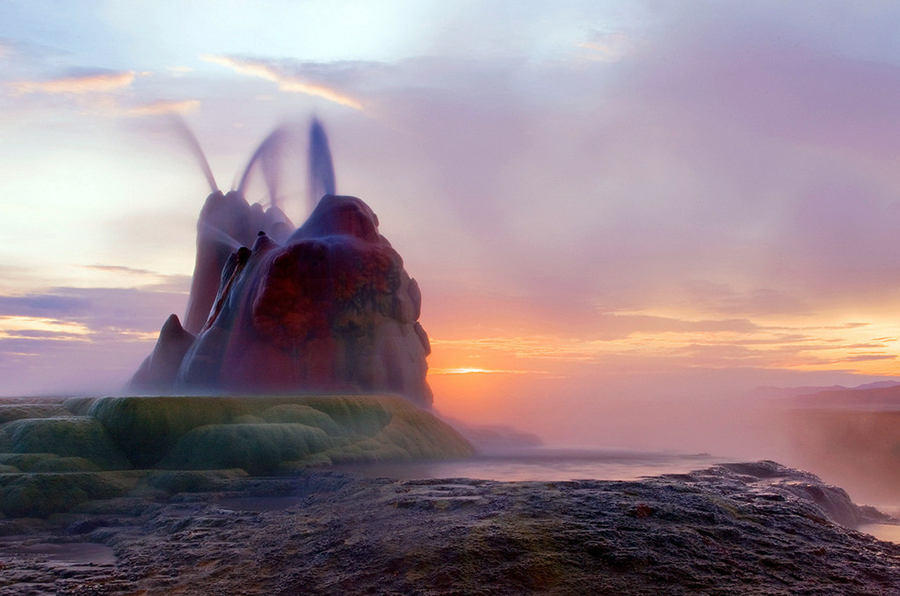 飞翔间歇泉位于内华达州黑岩沙漠一片私人土地上,它是人类改造自然创造的独特美景的一个典范。1916年钻的一口井,为地下深处的超热液体涌出地面打开了“方便之门”,这口井因为无法用于灌溉,因此被人遗弃。随着时间推移,不断涌出的富含大量矿物质的水慢慢形成一连串像山的锥形体,并在位于它们下方的广阔地区形成台地和水池。飞翔间歇泉因为含有大量矿物质和几种喜欢生活在热水里的细菌,因此具有非常鲜艳夺目的颜色。这个间歇泉的大小和知名度都在与日俱增:在附近举行燃人节的组织者试图购买飞翔大农场包括这个间歇泉的部分。