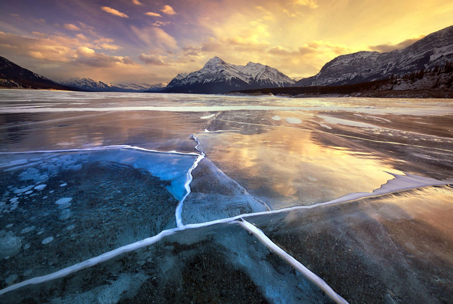亚伯拉罕湖为加拿大艾伯塔省西部北萨斯喀彻温河上的一座人工湖,面积约为53.7平方公里,纵长约为32公里。它建于北萨斯喀彻温河的上游,加拿大落基山脉的山脚下。亚伯拉罕湖形成于1972年,最神奇之处出现在冰冷的冬季,每当到了冬季,湖面下就会聚集大量的冰冻气泡,之所以会如此,是因为湖床植物释放的沼气和湖面低温所致。当沼气不断的涌向湖面,气温不断降低湖面结冰时,气泡就会被冰封,形成人间罕见的美景,吸引着世界游客冬季的造访。