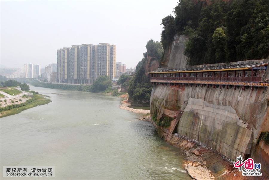 7月9日,湖北省恩施土家族苗族自治州恩施市,位于清江上方悬崖上的清江鹰嘴岩文化遗产项目壁画长廊。中国网图片库 谢顺/摄