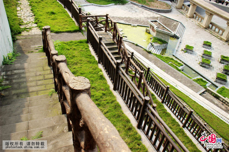 2015年7月9日,重庆现折叠梯道,层层叠叠,让人眼花缭乱。折叠木藤梯道位于重庆市南岸区,扶手采用仿真木藤造型,梯道折叠5个来回,垂直落差15米,依山而建,附近居民每天爬梯道上下。山城重庆多梯道,魔幻3D立体奇葩地形广受国内外关注。中国网图片库 刘向龙/摄