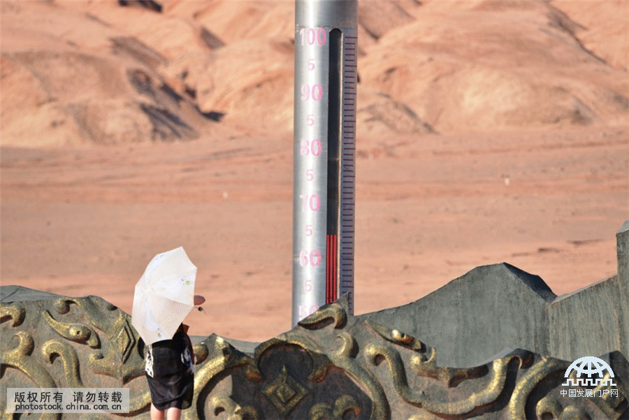 2015年7月20日,新疆吐鲁番,当天傍晚时分(18:30左右),一名游客在火焰山风景区的巨型电子温度计前游览,温度计上显示的适时地表温度接近65摄氏度。中国网图片库 姜晓明/摄