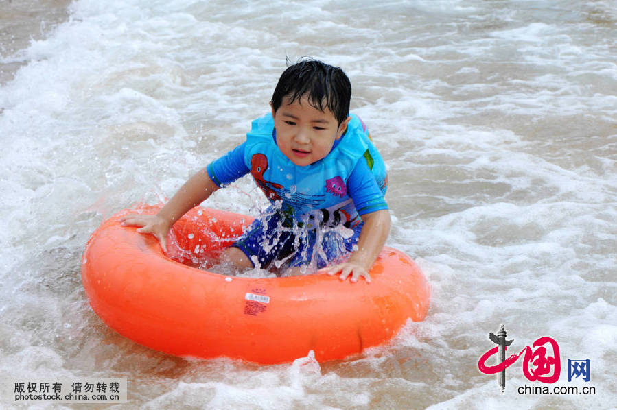 一位小游客被海浪推向岸边