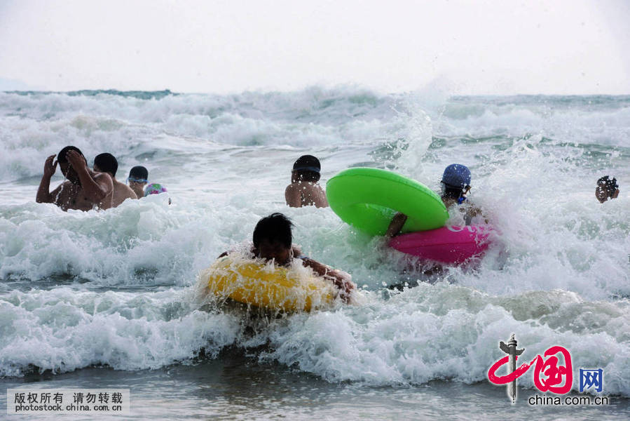 游客在海水中逐浪