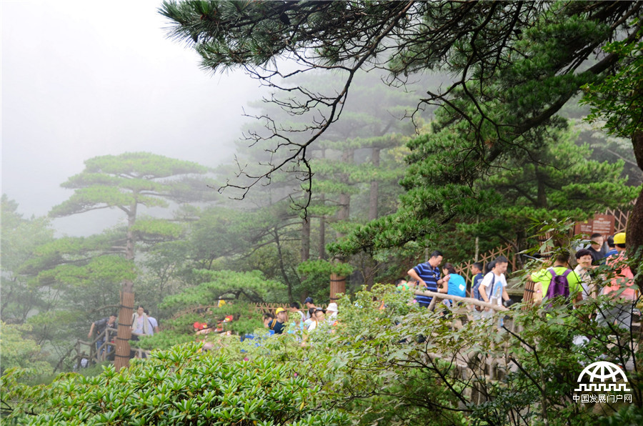 中国发展门户网讯(方立华)8月13日,安徽黄山风景区云雾缭绕,群峰时隐时现;流云与奇松,怪石、清泉、日出等景观,构成了一幅幅泼墨山水画。旅游公路上的大巴,川流不息;游道和景点上的游客摩肩接踵。据了解,暑假以来,黄山风景区每天进山游客在2万人左右。这是当天在玉屏景区拍摄的照片。