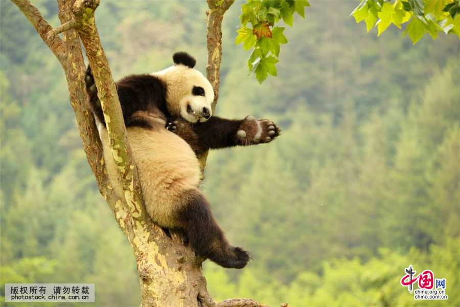 8月26日,位于四川省阿坝州汶川县耿达乡的中国保护大熊猫研究中心耿达基地,一只大熊猫在树上睡觉时翻身。中国网图片库 罗星汉/摄