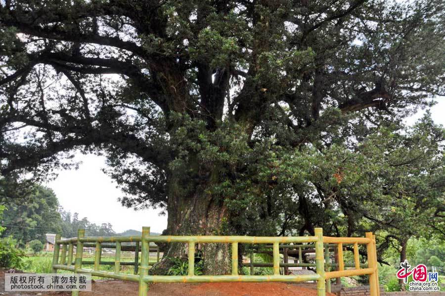 江西省遂川县衙前镇塅尾村一株千年罗汉松,苍劲婆娑,枝繁叶茂,遮阴蔽日,树龄为1300-1500年,树干围径5.82米,树高21米,树冠覆盖面积约360多平方米,号称“天下第一罗汉”。经省内林业专家考证,从目前所发现的罗汉松与之比较,实为江西之最,江南罕见。(2013年7月21日摄)中国网图片库 肖远泮/摄