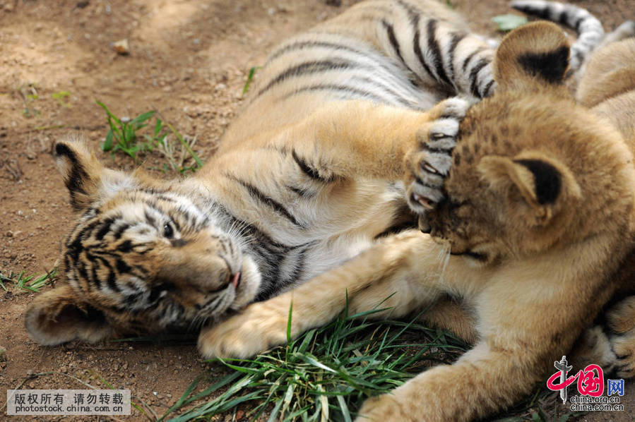 山东青岛森林野生动物世界出生3个月的小狮虎在玩耍(摄影 中国网图片库/俞方平)