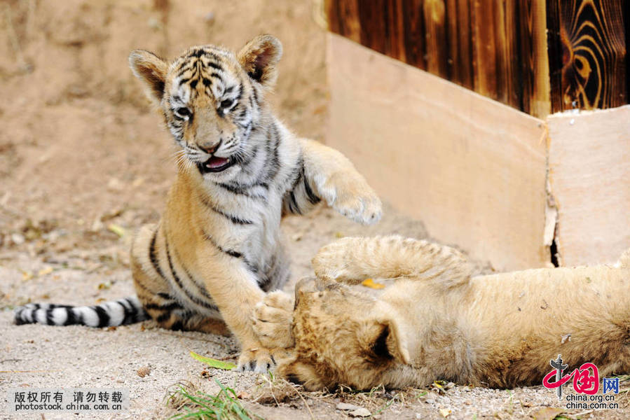 山东青岛森林野生动物世界出生3个月的小狮虎在玩耍(摄影 中国网图片库/俞方平)
