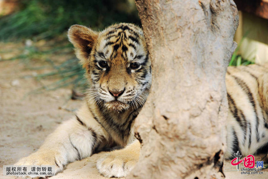 山东青岛森林野生动物世界出生3个月的小狮虎在玩耍(摄影 中国网图片库/俞方平)