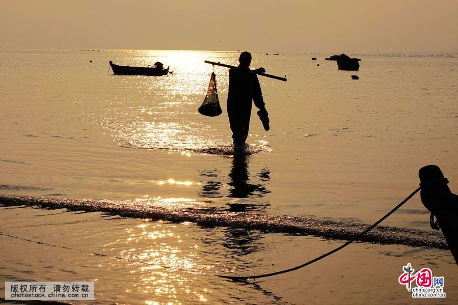 又是斜阳西下时,青岛鱼鸣嘴小渔村的前海湾畔,呈现着一种原始古朴的美:归航的渔船,赶海的人们,休憩的海鸟,以及侧岸飘摇的芦苇……如歌,如画,都在暖暖的静谧中悄然隐入这如水的光阴。(中国网图片库摄影/韩波)
