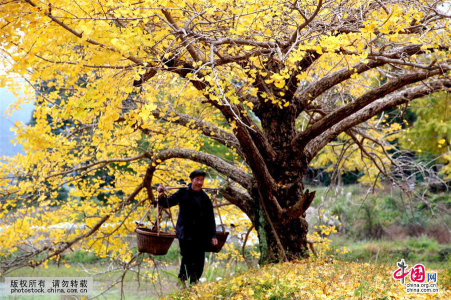 11月22日,一名群众在广西兴安县漠川乡久中村一株金黄的银杏树下走过。中国网图片库 王滋创/摄
