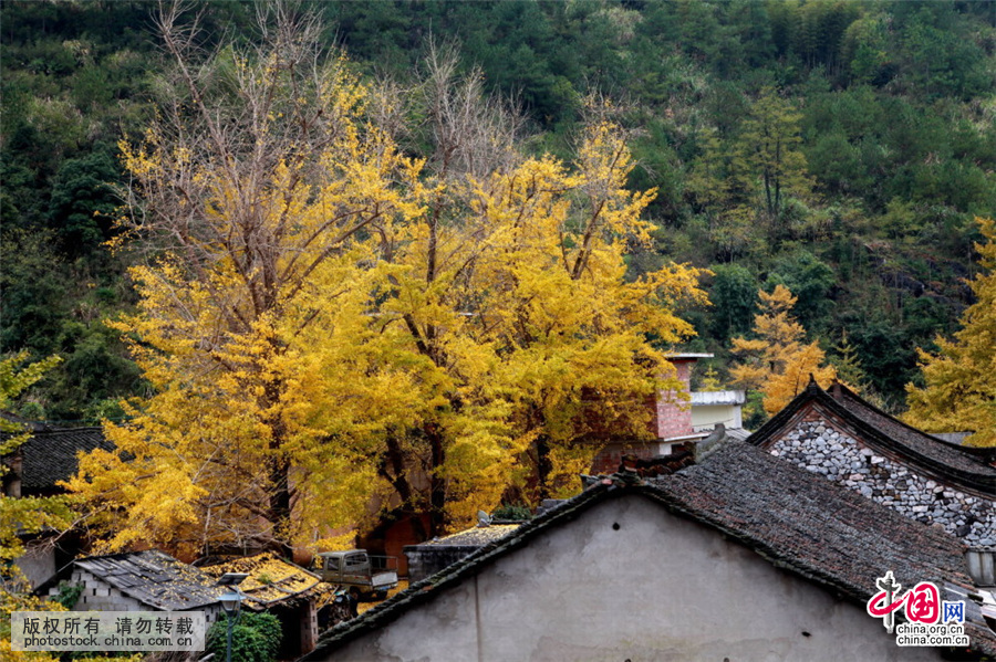 11月22日,广西兴安县漠川乡钟山坪村民居与金黄的银杏树相映成景。中国网图片库 王滋创/摄