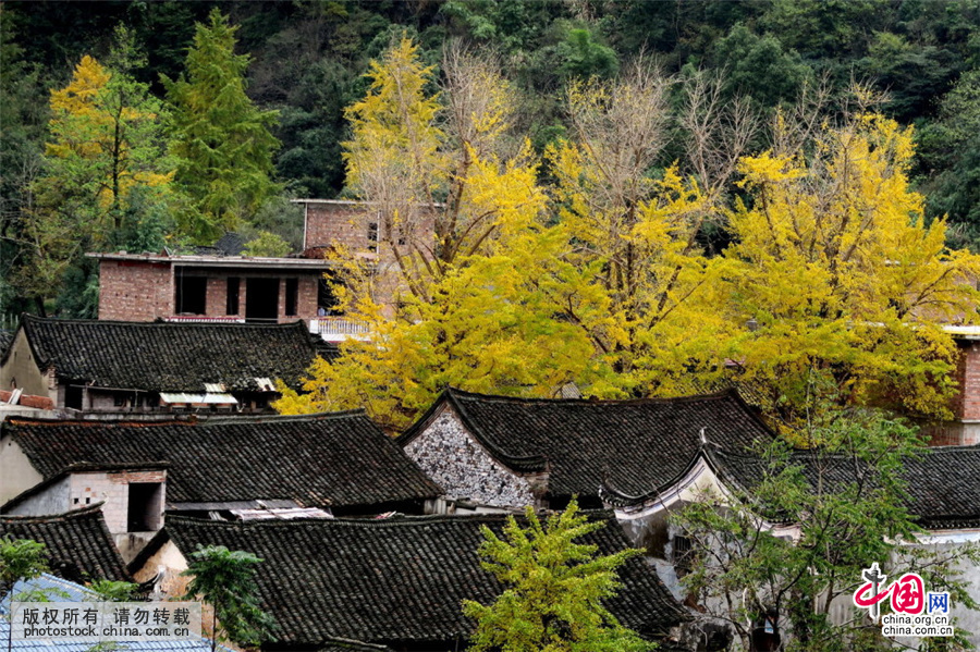 11月22日,广西兴安县漠川乡钟山坪村民居与金黄的银杏树相映成景。中国网图片库 王滋创/摄