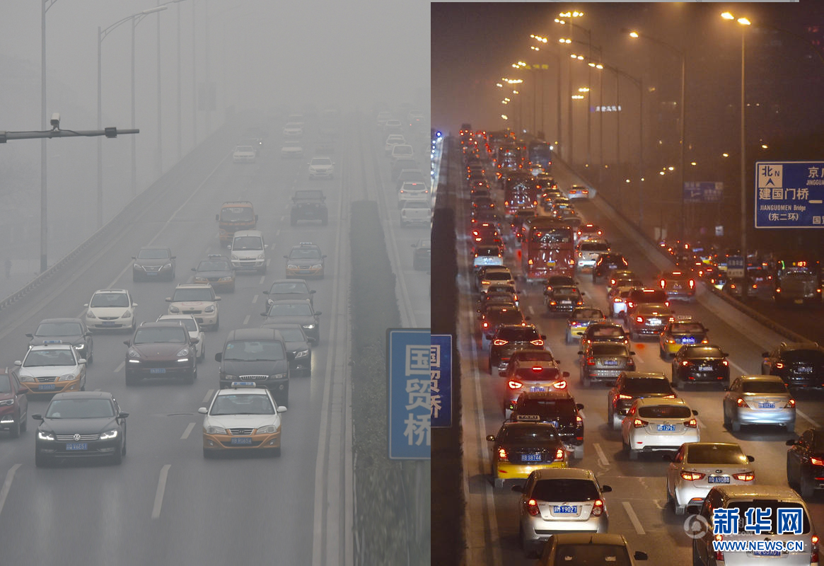 2015年12月08日,北京,北京首次启动空气重污染红色预警措施,一些景点笼罩在雾霾天气里变得模糊不清。(拼版照片)国贸桥