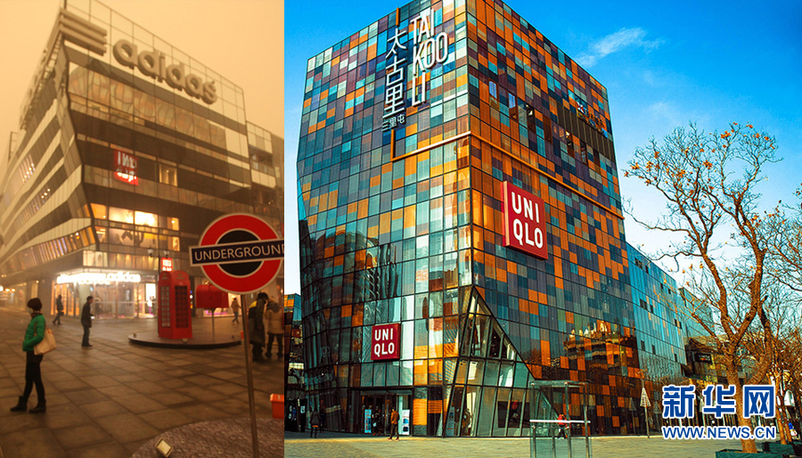 2015年12月08日,北京,北京首次启动空气重污染红色预警措施,一些景点笼罩在雾霾天气里变得模糊不清。(拼版照片)三里屯太古里