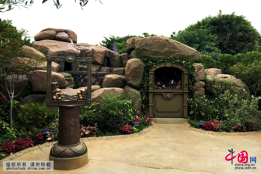 白雪公主的园景中可以看到,小矮人糊涂蛋乘着满载宝石的矿车,穿梭在矿山里,而其余小矮人在屋子里努力地工作。 中国网图片库 乙戌摄影