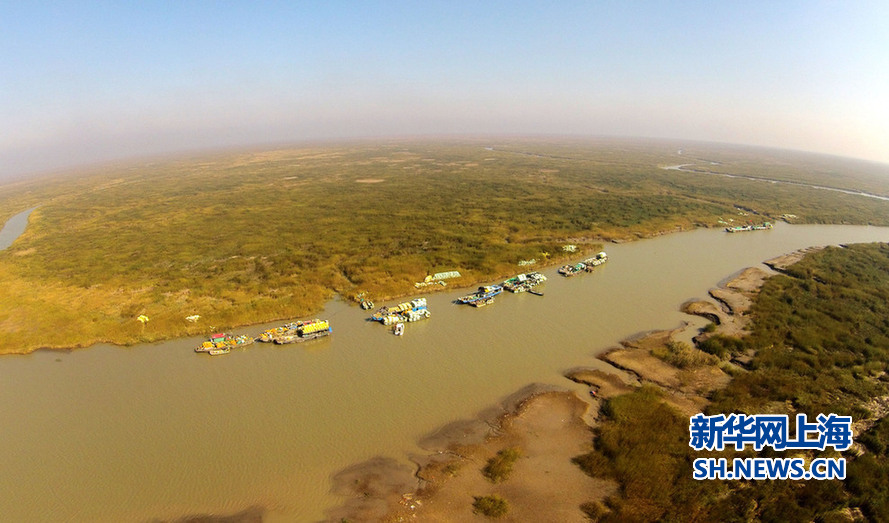 图为上海九段沙湿地国家级自然保护区航拍,“沟槽”上停靠的渔船。