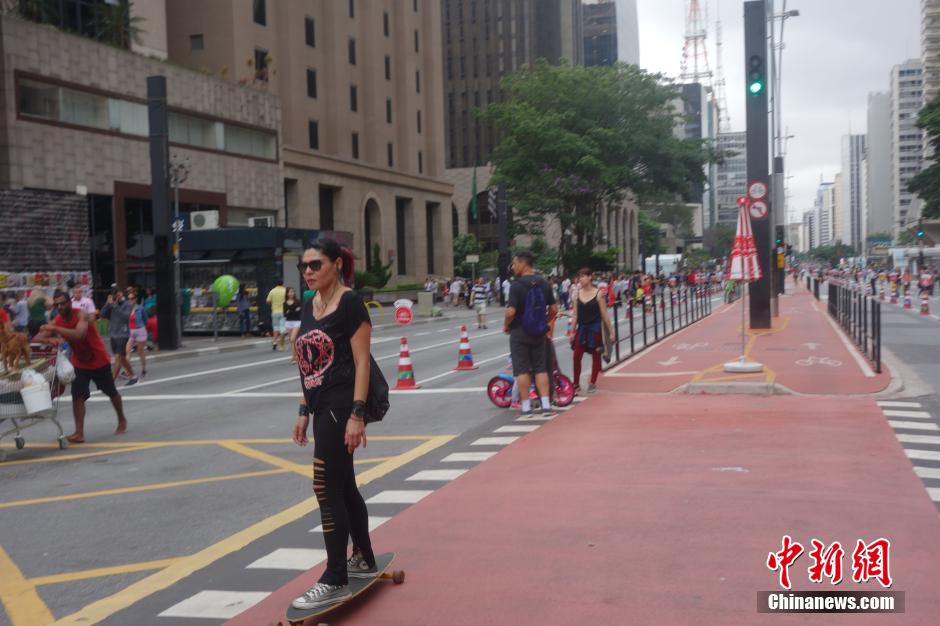 当地时间1月3日,巴西最大城市圣保罗在闹市区主街道保利斯塔大街实行交通管制,禁止机动车辆行驶,供民众休闲度假,人们纷纷到这里骑车、滑板、散步和游玩,街头人流不息,热闹非凡。图为一名女子在进行滑板玩耍。中新社记者莫成雄 摄