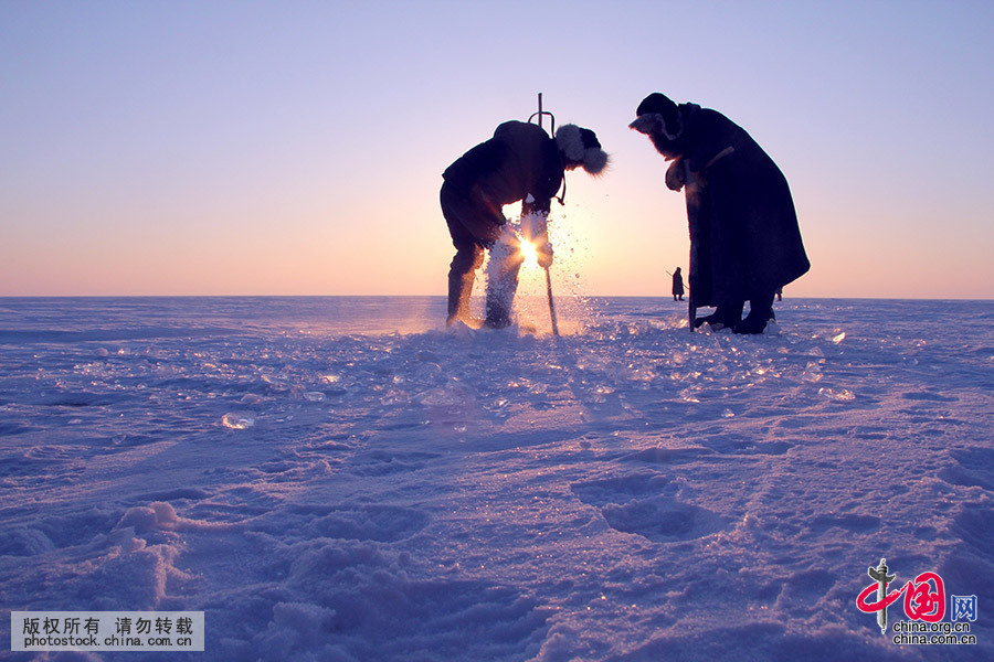 渔工们冒着零下20-30摄氏度低温,在毫无遮挡的查干湖冰面上作业。中国网图片库 王薇 摄