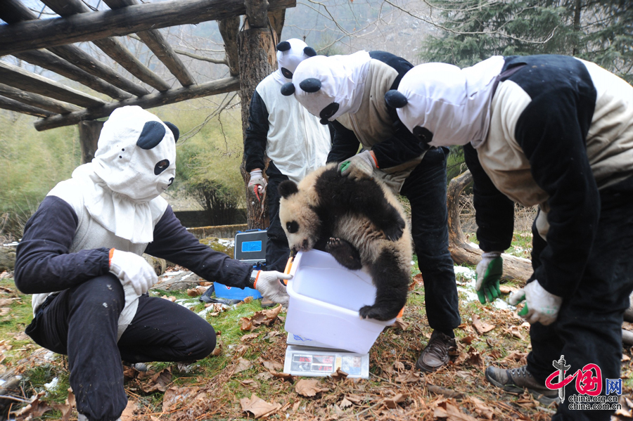 新妮儿仔称体重。(图片由中国大熊猫保护研究中心提供)