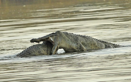 尼罗鳄生活在非洲,其牙齿咬力居动物界之最,可达到5000磅力。成年尼罗鳄身长可达5米,是世上第二长爬行动物。尼罗鳄身上的鳞甲非常坚硬,但是脖子和嘴附近的鳞甲相对较薄,因此照片中第一只鳄鱼才得以咬进另一只的脖子里。