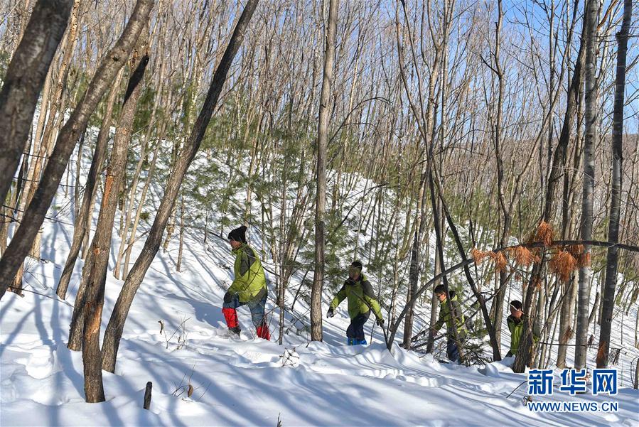 新华社照片,珲春(吉林),2016年2月4日 “长白林海”间穿行的东北虎守护人 2月3日,巡护员在珲春东北虎国家级自然保护区内巡护。多年来,为保护野生东北虎、豹,珲春林业的东北虎巡护员翻遍了吉林珲春东北虎国家级自然保护区108700公顷的崇山峻岭,累计完成巡护2000余次,巡护里程20余万公里,平均每天要在崎岖的山林中往返穿行数公里。举行大规模联合清山清套行动50余次,清缴夹子、猎套等非法猎捕工具9000多个。如今,珲春林业共检测到野生东北虎、豹活动信息700余次。据介绍,在珲春林区定居和通过珲春林区向省内迁徙的野生东北虎、豹数量已达到27只和42只。新华社记者许畅摄