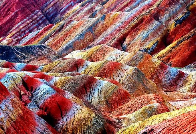 甘肃张掖的丹霞地貌,是大自然的神工鬼斧劈就的童话世界。阳光洒下,坚硬的山脉石头竟泛起晶润的光泽,极目远眺,一片灿然夺目,世界顿时异彩纷呈,看得满眼都是热闹与烂漫!