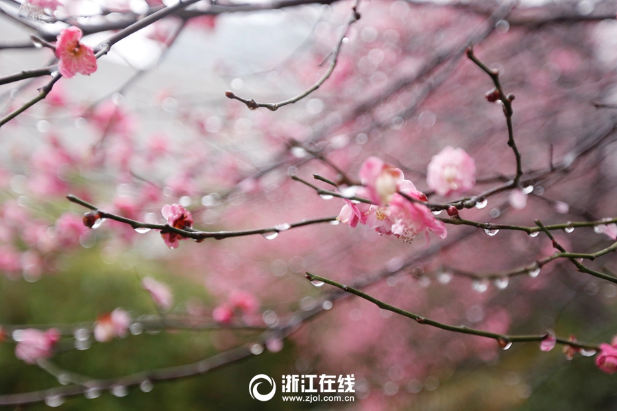 2月22日,杭城迎来阴雨天气,冷意浓浓,而梅花却不惧寒冷,在雨中悄然绽放。绵绵春雨洗去了花瓣上的灰尘,花间枝头挂着一颗颗晶莹的水珠,使梅花显得越发娇艳欲滴。(浙江在线记者于诗奇 浙江日报记者 林云龙)