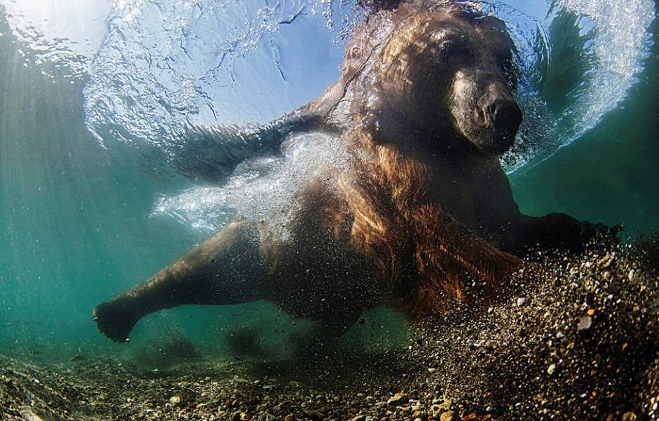 俄罗斯摄影师迈克·卡洛斯特列夫(Mike Korostelev)抓拍的“水下渔夫”。他说:“我建造了一个笼子用于近距离拍摄棕熊。我进入笼子后沉入水中,等待棕熊接近。这头熊为了抓鱼将头深入水中大约20秒,它每天要来这个地方多次。” 图片来源:国际在线