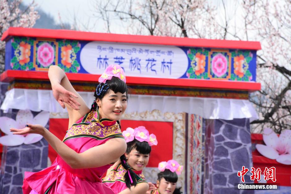 3月23日,西藏林芝第十四届桃花节在林芝市巴宜区嘎拉村开幕,由桃花节组委会精心策划组织的林芝市旅游形象大使暨第二届“桃花仙子”选拔赛的冠亚季军及优秀、入围选手等13人也亮相于开幕式,并上演精彩T台走秀。这些“桃花仙子”们都是来自于林芝各县(区)的工布姑娘,她们将作为林芝旅游形象大使,宣传林芝秀美风光和独特民俗风情。图为林芝桃花村上演特色民族舞蹈。中新社记者 陈韬彬 摄