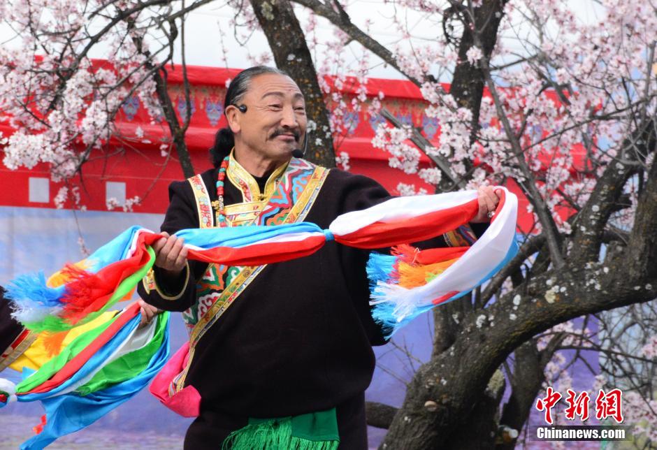 3月23日,西藏林芝第十四届桃花节在林芝市巴宜区嘎拉村开幕,由桃花节组委会精心策划组织的林芝市旅游形象大使暨第二届“桃花仙子”选拔赛的冠亚季军及优秀、入围选手等13人也亮相于开幕式,并上演精彩T台走秀。这些“桃花仙子”们都是来自于林芝各县(区)的工布姑娘,她们将作为林芝旅游形象大使,宣传林芝秀美风光和独特民俗风情。图为开幕式上,来自林芝民族艺术团的阿旺多吉演绎说唱+舞蹈的艺术形式。中新社记者 陈韬彬 摄