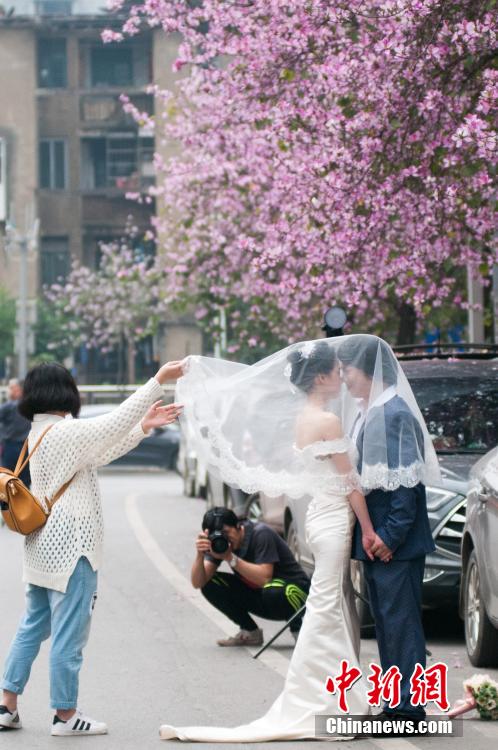 一对新人在洋紫荆花盛开的水南路上拍摄婚纱照。 黄威铭摄