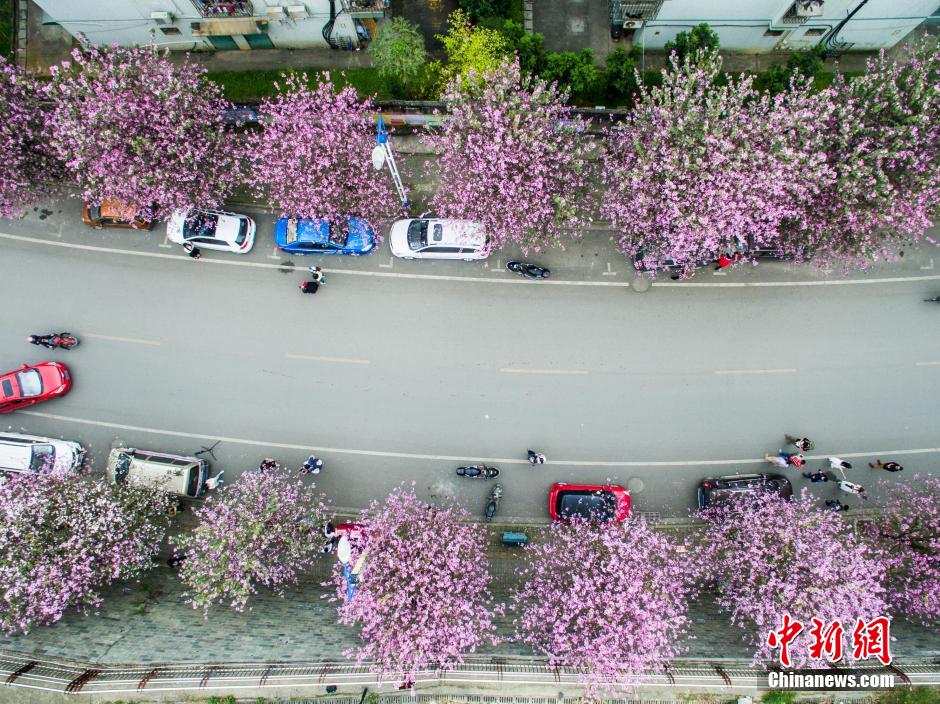 鸟瞰广西柳州市水南路,两侧紫荆花开让街道变靓。 黄威铭摄