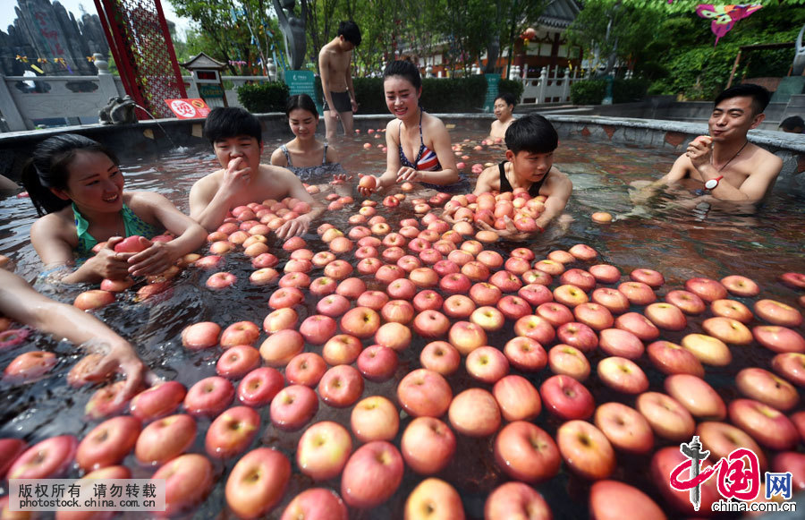 2016年4月28日,河南省洛阳市,洛龙区王城大道南的一温泉景区举办“温泉水果浴”,苹果泡满温泉池,游客边苹果吃边玩。中国网图片库凤翔摄影
