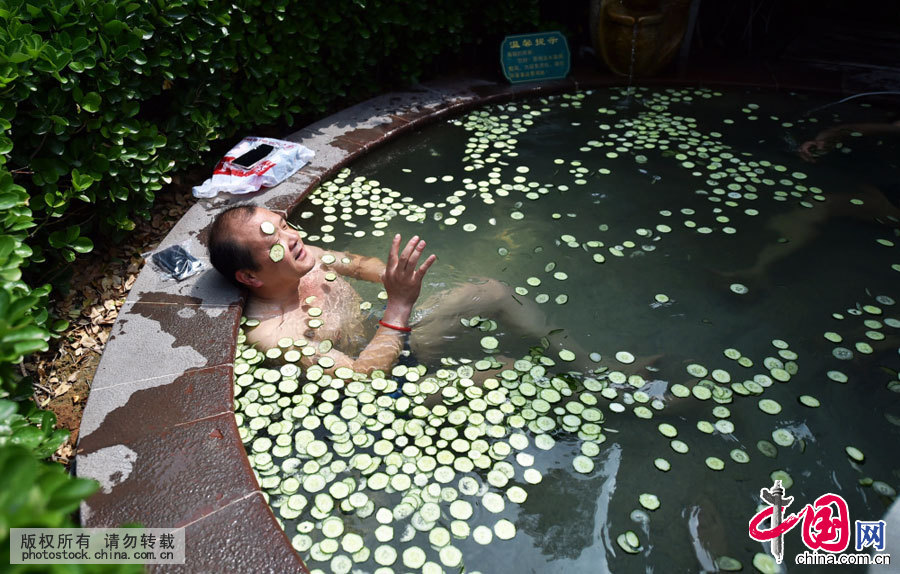 2016年4月28日,河南省洛阳市,洛龙区王城大道南的一温泉景区举办“温泉水果浴”,黄瓜泡满温泉池,游客边玩边敷黄瓜面膜。中国网图片库凤翔摄影