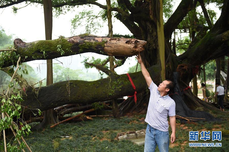 5月9日,景区工作人员在查看大榕树。受连日强降雨影响,广西桂林市阳朔县遭遇罕见洪灾。国家风景名胜区大榕树景区有着1426年历史的大榕树被洪水带来的杂物折断多根树枝。新华社记者陆波岸 摄